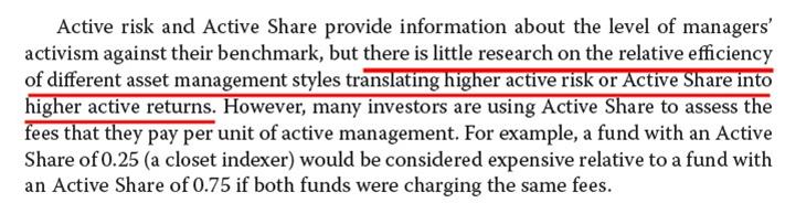 同学你好,active share高不一定就有更高的捕获alpha的能力。efficient portfolio structure的话要求的是你的收益可以被你的所承担的风险所解释。而且这个承担的风险要和投资者预期匹配。高的active shares只能说明portfolio的持仓和benchmark比较不一样,管理的主动性成分高,至于能不能够获得高active return不好说。书中也有类似表述(见图)