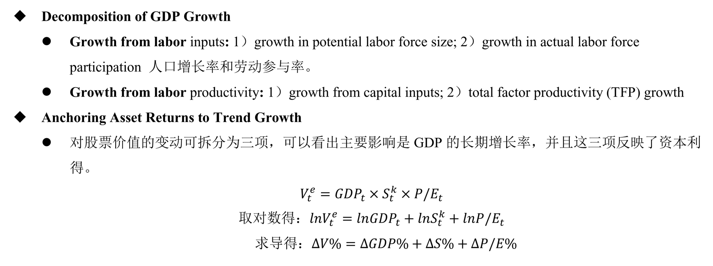 我们在讲到Decomposition of GDP Growth和Anchoring Asset Returns to Trend Growth时有说明这两个问题。具体见图