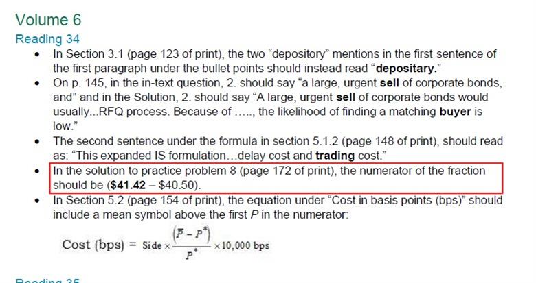 原版书课后题第八题,计算 arrival cost=(执行价格-benchmark)/benchmark *10000*side benchmark 选择执行时的价格40.5 执行价格应该为41.42吧? 为何答案用41.25 谢谢