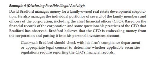 同学你好,主人公为家族地产公司管理资金,也在为这家公司的CFO管理个人资产,所以他有机构客户,也有个人客户。主人公发现CFO在挪用家族公司的资金,而两者都是他的客户。此时需要咨询法律顾问以及合规部门来评估是否要报告这件事,因为家族公司是客户,出于对客户的忠诚就需要告知,但CFO也是客户,虽然为了资本市场的诚信可以揭发CFO的行为(whistleblowing),但如果当地法律规定要为客户保密的话就不可以揭发出出来,因此是两难,需要寻求咨询。