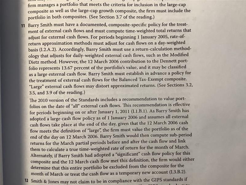 Provision I.2.A.2 specifies the use of time-weighted rates of return that adjust for external cash flows. For periods beginning on or after 1 January 2005, firms must approximate rates of return that adjust for daily weighted external cash flows, and we have seen that for periods beginning on or after 1 January 2010, firms must value portfolios on the date of all large external cash flows.