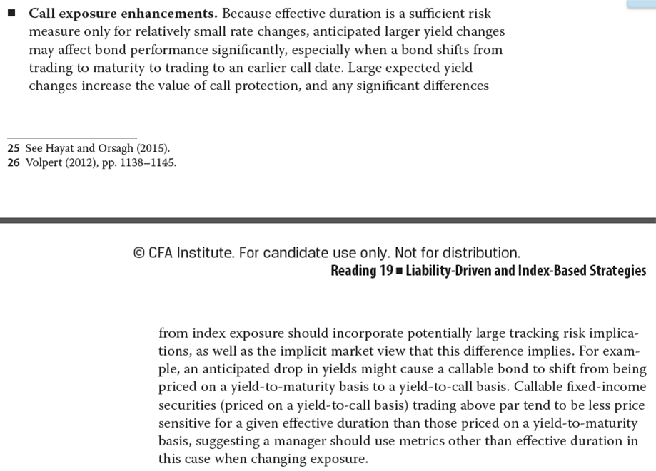 我理解的意思是有效久期仅能衡量利率发生较小变化时的callable bond变化,假设利率发生较大变化(变小),callable bond价格无法超过行权价,价格变化敏感较小。这时候如果需要改变敞口建议使用其他指标,而不是有效久期。