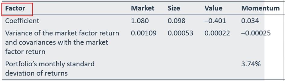 老师,reading25的基础课程的126页的例题中表格的左边那一列表头描述是不是有问题,如果是第一行不应该是资产的权重,那么如果是因子的话,就是相关系数吗?