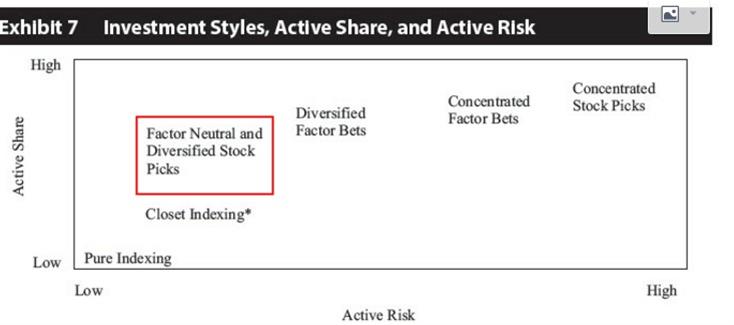 同学你好,一般来说active share高active risk高的,但是有一种情况就是组合和benchmark持股差异比较大,但是在factor 层面是diversified,那么这种情况下组合的active risk不会很高,对应图中的factor neutral and diversified stock picker。