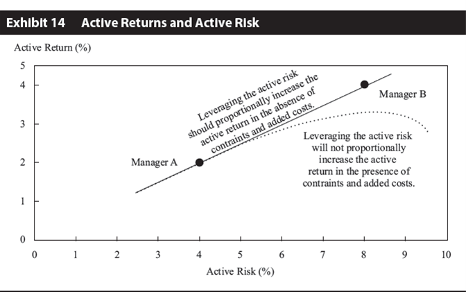 IR相同的两个基金经理Manager A\B,active risk较低的低的Manager A理论上(不存在任何限制和成本的情况下)提升active risk的同时可以提升相同比例的active return,从而保持IR不变的。因此他如果承担和Manager B一样高的active risk就能获得Manager B的active return。但由于short position限制或者证券流动性低等等,以及增加的cost,使得active return增加的幅度低于active risk,导致IR降低。这题就是根据这个结论来做题的。