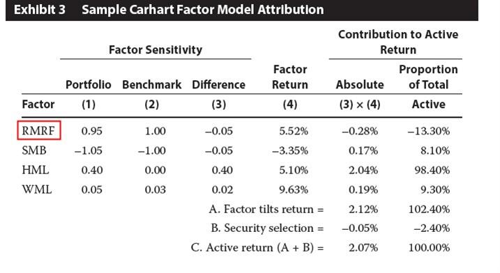 同学你好,根据Exhibit 3, 我们可以看到portfolio在因子RMRF(市场因子)上的权重为0.95,而benchmark在该因子上的权重是1,因此portfolio的beta略低于benchmark。又因为该因子的收益为正,低配市场因子(即较低的beta)是拖累组合收益的。