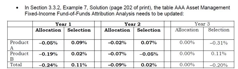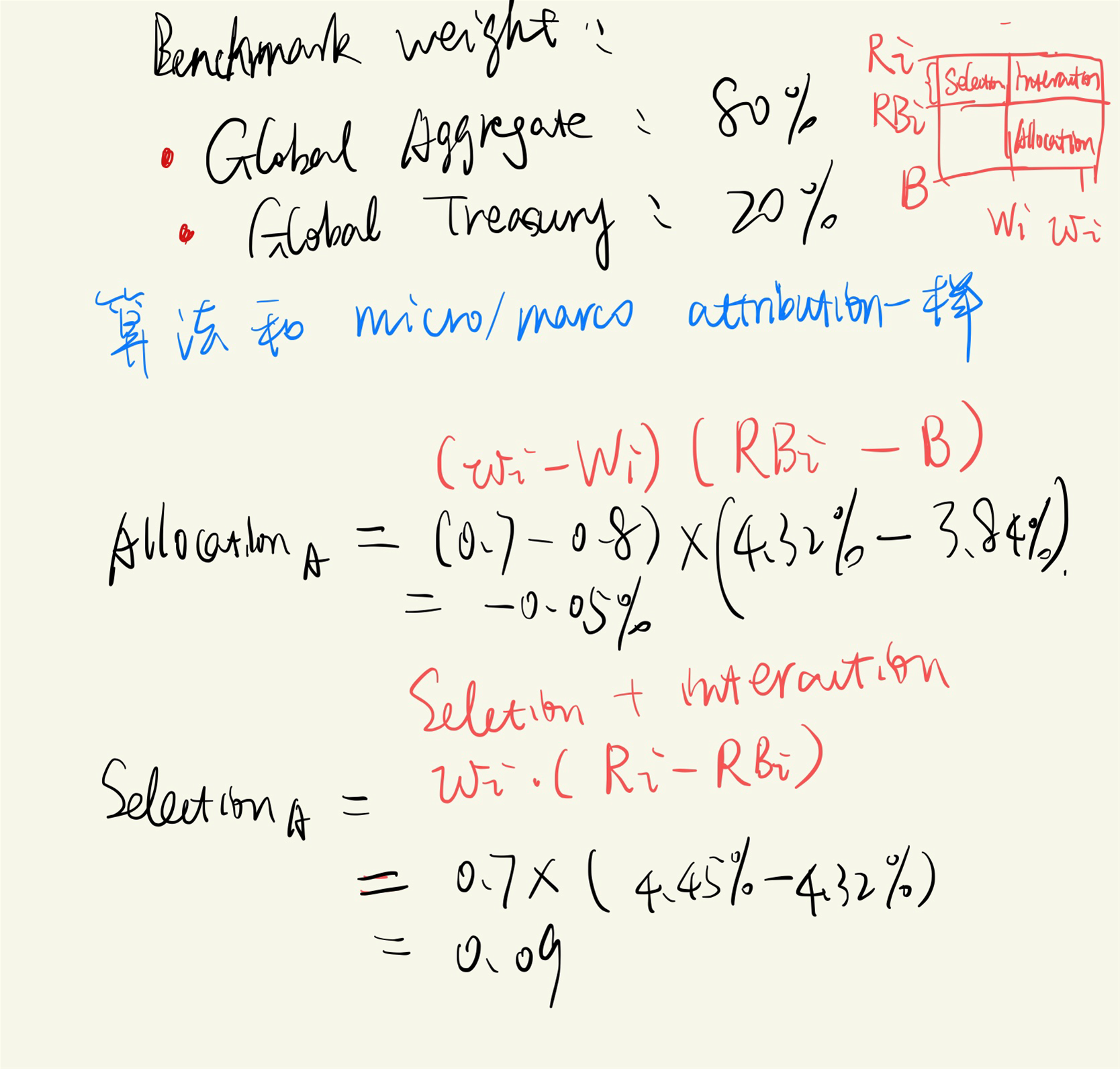 同学你好,首先协会勘误过了,原来的表格里的计算结果是错的。正确的见图。表格中的allocation 和selection(其实这里的是selection+interaction,就像micro/macro attribution一样,selection+interaction是不会单独让你计算的,都是合在一起的)的计算方法和micro/macro attribution一样。