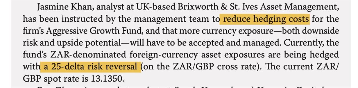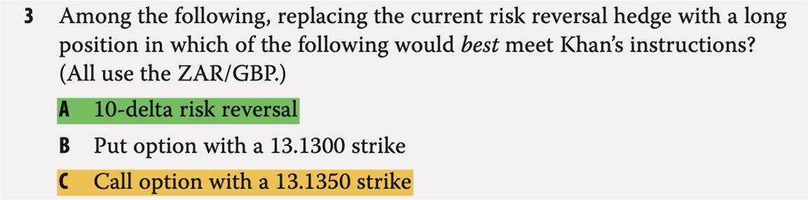 1.本题有点特殊,外汇形式是ZAR/GBP,而且有ZAR-denominated foreign-currency asset exposures,也就是S,应该是long risk reversal,也就是+C-P(针对GBP而言),那么对于ZAR就是-C+P(两者相反)。整体组合是S+P-C,也就是collar,能形成hedge。