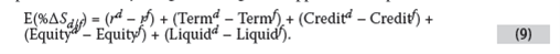 这部分是在资本流动里描述的。由于汇率变动会同时影响以不同货币计价的所有资产的相对价值,因此我们预计,每当需要调整资本流动时,汇率将受到巨大压力。在一个资本流动性完善的世界中,汇率将被驱动,即汇率的预期百分比变化等于未来一段时间内国内投资组合的“超额”风险调整预期收益(相较于外国)。实际上就是上述给出的公式。