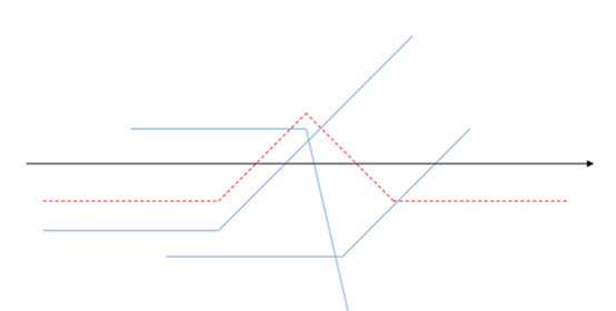 butterfly spread是如图红色虚线所示,买入两份不同行权价格的call,卖出两份同一行权价格的ATM put形成。波动率降低会盈利,增大会亏损。