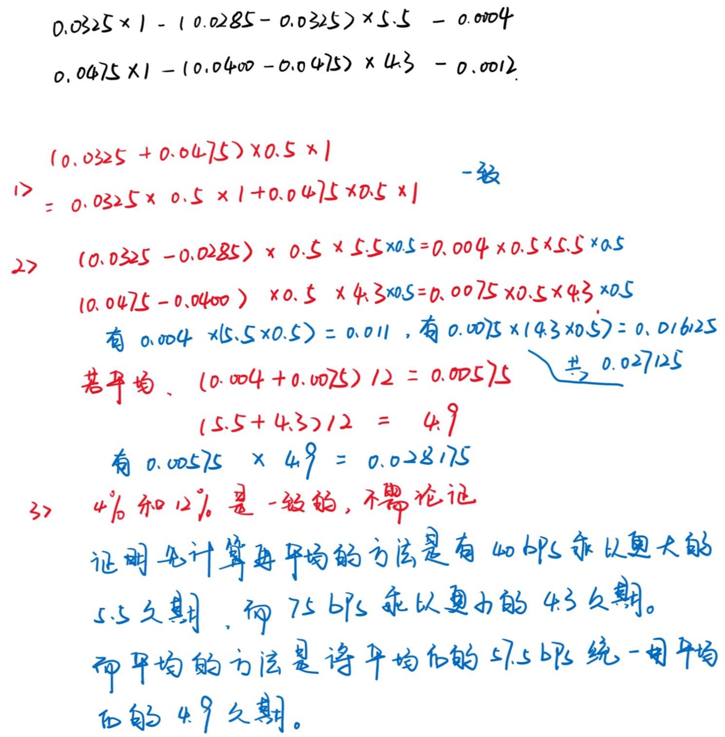 我在计算第1题时,先将债券2和债券3的预期超额回报率(expected excess return)计算出来,再将它们加权平均。债券2的预期超额回报率为3.25%*1-(2.85%-3.25%)*5.5-0.04%=5.41%,债券3的预期超额回报率为4.75%*1-(4.00%-4.75%)*4.3-0.12%=7.855%,将两者平均(权重各为0.5)得(5.41%+7.855%)*0.5=6.6325%。但本题的正确答案为6.76%。正确答案的思路是先将债券2和债券3的OAS、ΔOAS、久期等求平均之后,再一口气算出由债券2和债券3构成的投资组合的超额回报率。那么,为何两者会产生差异呢?望给予解答。谢谢!