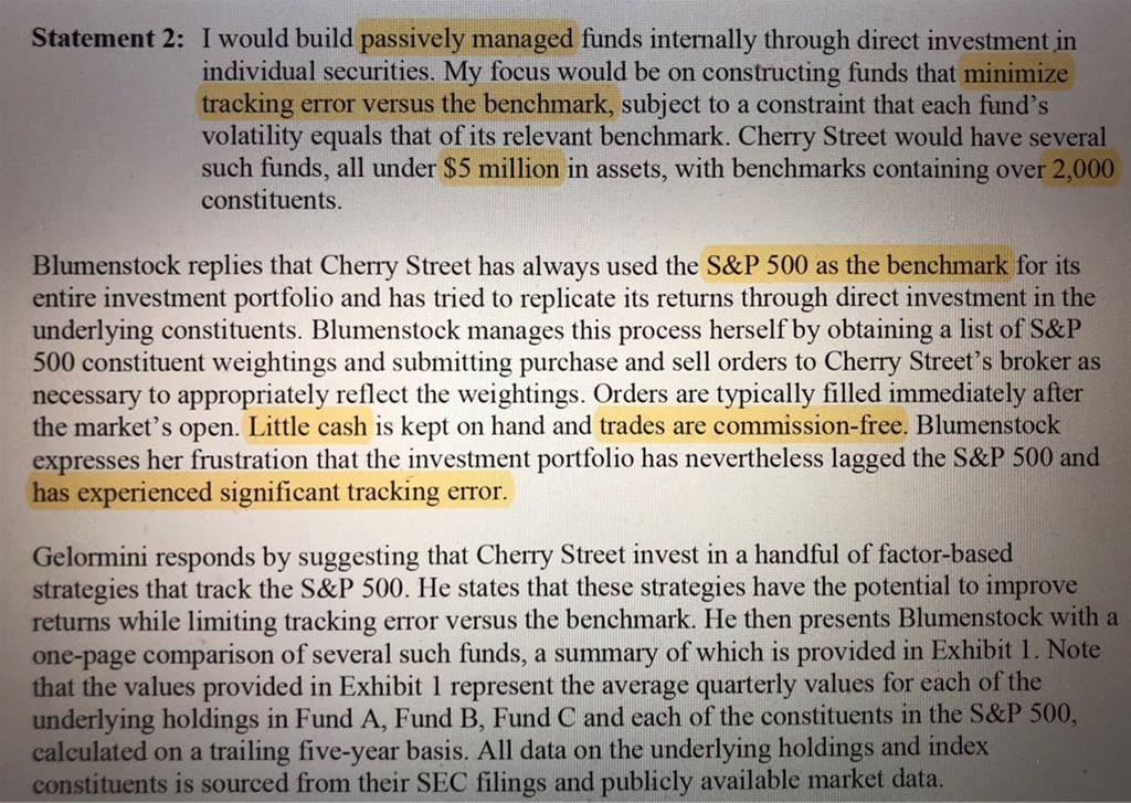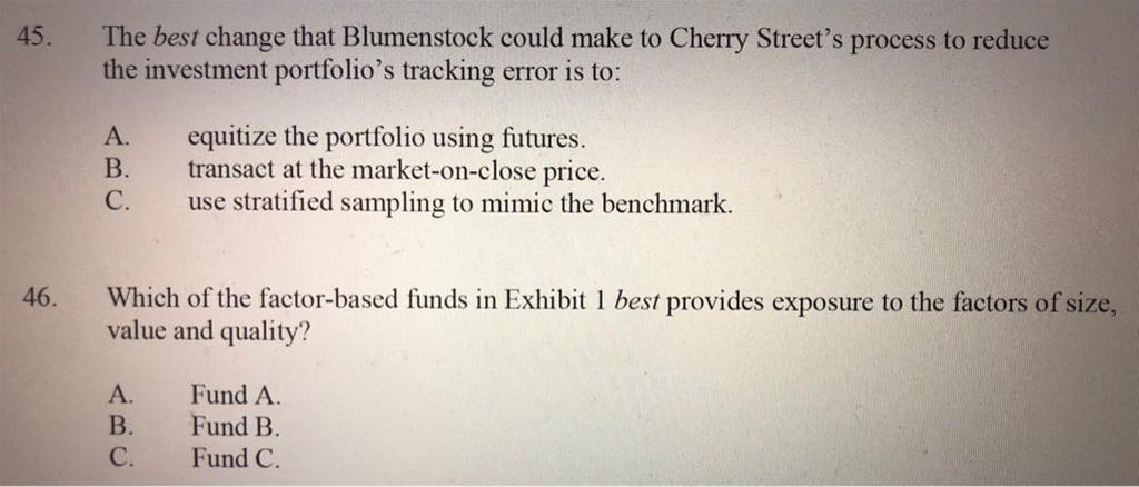 45题,问如何改善cherry street跟踪误差大的问题,A不对因为cherry street持仓中现金不多,不需要EQUTIZE。C也不对,因为cherry street 的资金量完全够,且标普500指数的成分股流动性都较好,能完全复制的不用抽样。选B是因为指数的价格计算是收盘时计算的,但是cherry street却在开盘后就买卖了,这是造成跟踪误差的主要原因,所以建议把交易改成在接近收盘时进行。