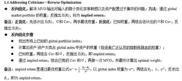 同学你好,可以参考下图。高度依赖于资产大类特性就是对input太敏感,资产的风险或者收益率发生一点变动就会导致整体资产配置发生重大改变,那么reverse MVO就防范了这一点,它所得出的资产配置不会对资产特征过度敏感。