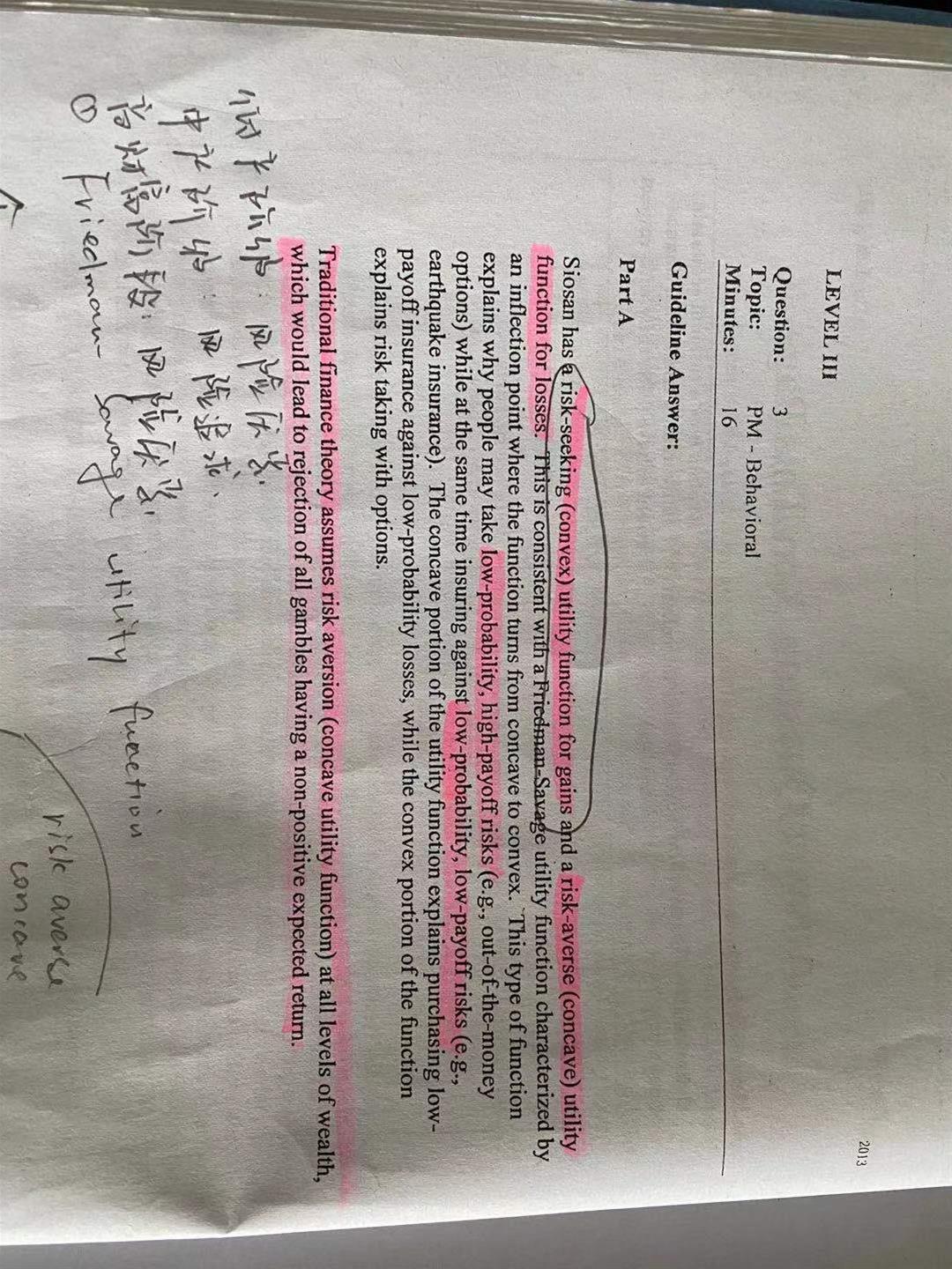 历年真题 - 行为金融学 - 2013年 题A:Friedman-Savage double-inflection utility function讲的是低产阶级风险厌恶;中产阶级风险追求;高财富阶段风险厌恶。答案中说risk-seeking for gain, risk-averse for loss, 本质含义其实和Friedman-Savage不一样,只是这题中有inflection point where the function turns from concave to convex, 但这个inflection function的横坐标也不是wealth, Friedman-savage的横坐标是wealth. 请问这道题的考点是啥意思?以及我们答题的时候的得分点是哪几点?