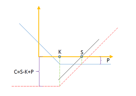 实际定价的过程仍是C=P+S-X折现。如下图所示,S+P合成得到的C的定价中仍然包含了X(也就是图中的K)。