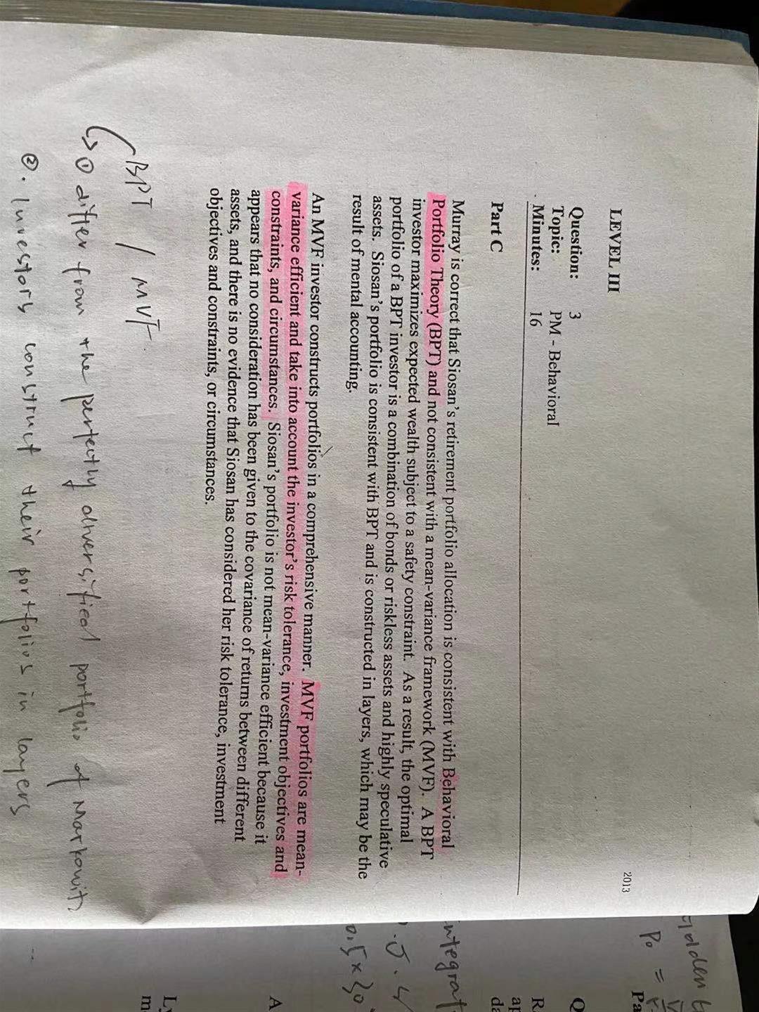 历年真题 - 行为金融学 - 2013年 C 可否概括成三个得分点? 1、Murray is correct that Siosan's retirement portfolio allocation is consistent with Behavioral Portfolio Theory and not consistent with a mean-variance framework. 2、BPT investors construct their portfolios in layers. Siosan's portfolio is consistent with BPT and is constructed in layers (money-market securities and speculative stocks) 3、"Mean-variance portfolios are constructed as a whole, and only the expected return and the variance of the entire portfolio matter"