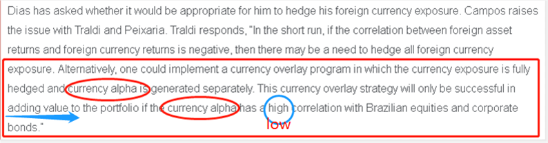 2.本题进行fully hedge,相当于把beta因子的敞口全部hedge,只希望得到超额收益alpha。但currency alpha和别的资产的相关系数应该越低越好,这和一般的资产配置理论是一致的。也可以参考原版书364页。
