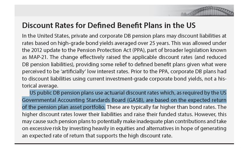 你可能说的是这种情况:US public DB pension plans use actuarial discount rates which, as required by the US Governmental Accounting Standards Board (GASB), are based on the expected return of the pension plan asset portfolio.