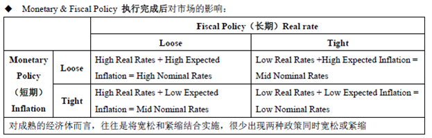 货币政策影响通胀,财政政策影响真实利率,那么现在是货币政策宽松,通胀上升;财政政策紧缩,真实利率下降。总体的变动是不确定的,可以参考截图。
