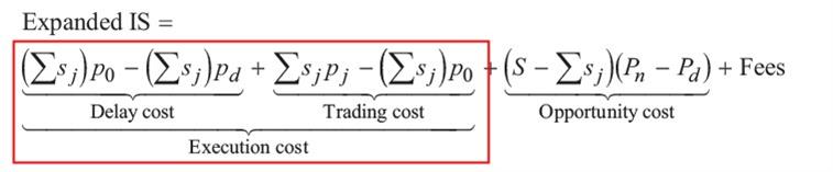 同学你好,delay cost 是execution cost的一部分,execution cost由delay cost和trading cost组成。delay cost是指由于延迟没有在第一时间把订单提交到市场上导致的成本。trading cost是指在交易的过程中,市场价格发生变化所导致的成本。