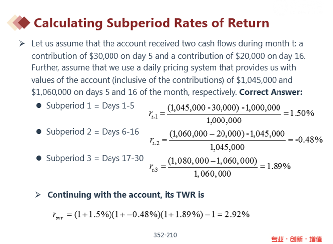 同学你好,这一题的解法就是用TWRR,因为它是在2010年之后,可以参照下方讲义,TWRR在每次产生重大现金流时就要估值一次,而且它是剔除现金流影响的。1月的收益率就是208000/200000-1=4%。