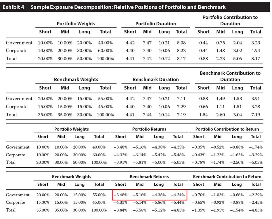 同学你好,根据exhibit4,我们可以发现benchmark在所有duration段的return都是负的,表明各期限的利率都是上行的。portfolio的duration比benchmark大,因此在利率上行的环境中表现更差,所以相对于benchmark,portfolio在duration effect上损失-0.62%。所以老师也说了,组合超配长期债赌收益率下行赌错了。