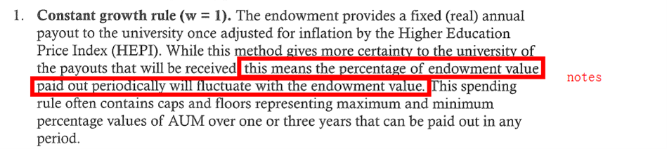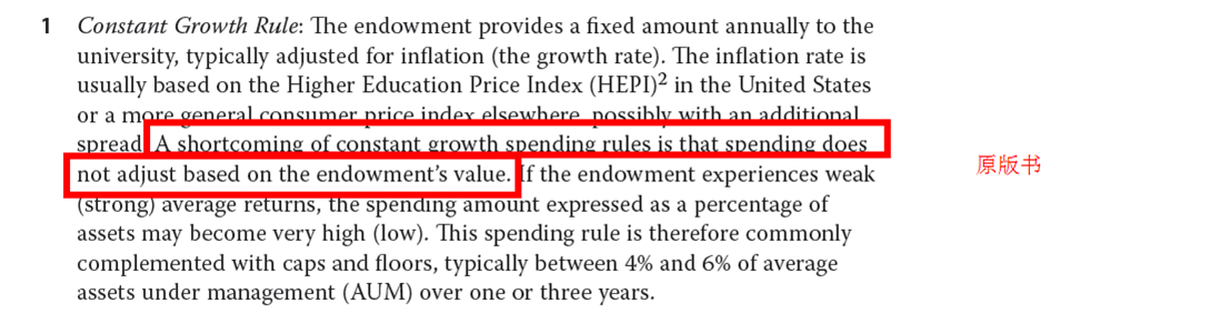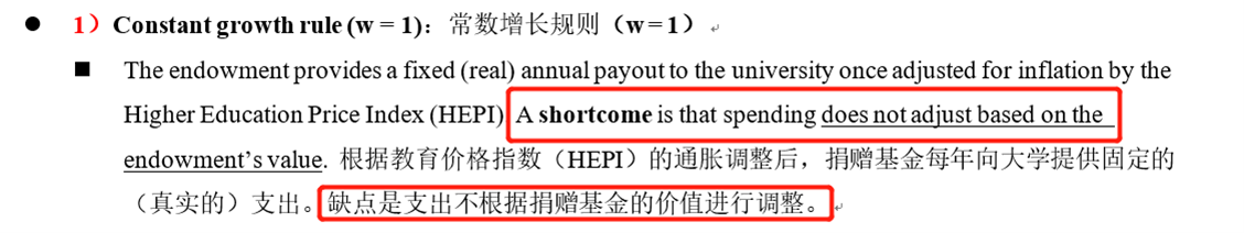 原来上面那句话是哪来的?麻烦老师讲清楚吧,CFA也教我们要全面分析,有理有据,我认为 错的那句话也不像是 编书的老师自己写的吧?应该 是 从 原版书复制错地方了 ,我想知道错的那句 “这种方法使得大学收到的金额更确定,在这种 情况 下每年收到的 金额 会 随着总基金 价值波动 ”对应的是哪种规则。