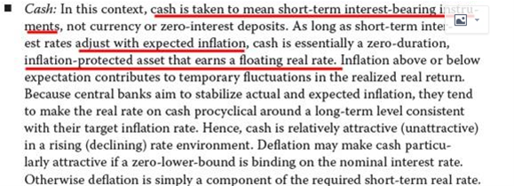 这里的现金及现金等价物指的是短期计息的金融工具,因此它的回报率假设是会随着通胀的调整而较快调整的。cash is taken to mean short-term interest-bearing instruments, not currency or zero-interest deposits.