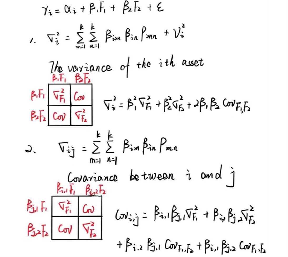 如果构建组合用的是各自的β和factor,那么可以用β和方差计算。逻辑相同,即协方差矩阵公式,我也把好理解的方式画在了图中,供参考。
