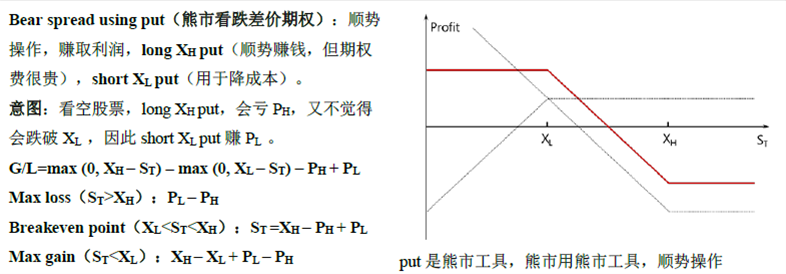Bear spread using put是两个put option,没有买股票。这道题目中加入股票后图形会发生变化,等于期权赚的一点盈利会在股票亏损较多的时候被抵消甚至是亏损。