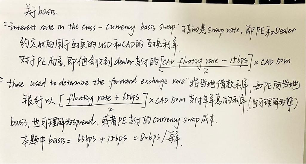 cross currency swap相关的题目,这里的basis指的是什么?(我不是在问这个swap是什么,我知道是货币互换合约,是问下图这两个语境里basis是什么意思。positive basis指的是spread?