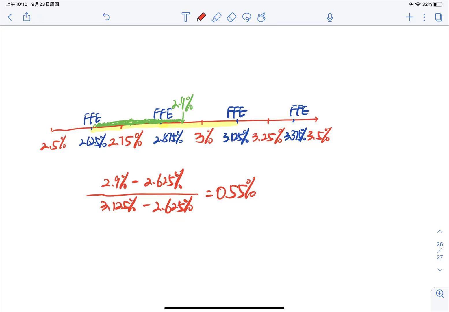 这种题都会给出一个当前的range。比如说,这个题说的The current federal funds rate target range is set between 2.50% and 2.75%.所以当前在这个范围内的FFE是2.625%,因此如果要算要从2.625%这个点来算。如果这样来算,概率应该是55%。通常来说美国加息都是加很小单位的,一下子加这么多的概率应该就是更低一些的才合理。这种题协会考核的很常规,就是换个数字让你计算一下。