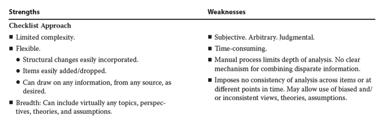 那么A选项是Checklist approach的优点,因为相对简单,没那么复杂,形成问题清单就可以,也更加灵活,增加或删减相关数据更加方便。