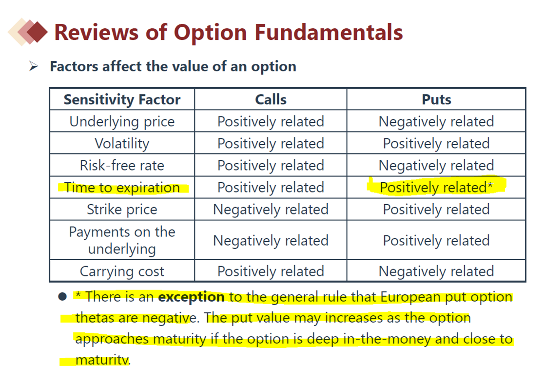 你好, 我还是不太理解这个put option的theta, 找到了这张图,里面直接说了欧式看跌期权的theta是negative。这个的逻辑是很清晰的,随着到期日的临近,任何一个期权的价值肯定都是下降的。而且欧式看跌应该更要下降,因为错过了最佳行权那个点。而且它的价值应该降的更多,因为其他期权还有可能赚更多,而欧式看跌错过那个0点,哪怕一天,都不再是payoff最多的了。也就是说今天价格到0,明天可以行权,它的价值也不如昨天高,也就是close to maturity, 它的价值降低,还是负相关啊。