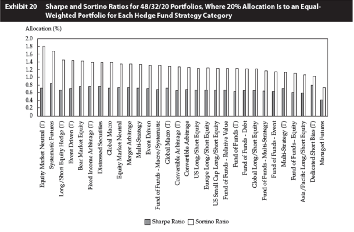 这里的总结是参考原版书中有相关历史数据的图表(见附件),原因是多策略对冲基金中通常费率较高,抵减回报率,并且我们在计算Sortino Ratio时通常更多的考虑是下行风险,考虑和原有资产的相关性。