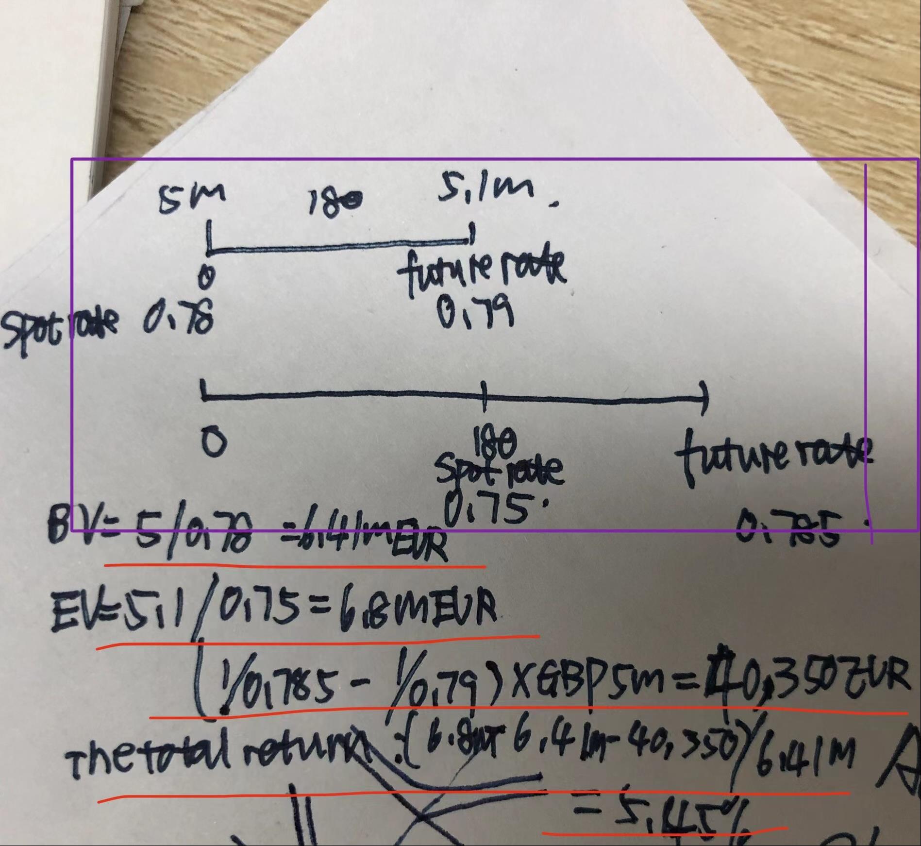 然后你还有对冲头寸,再把你的对冲头寸的盈亏算出来(不同头寸的盈亏要单独计算),这个公司是德国的,所以他的本币是EUR,但是这里给的标价是GBP/EUR是外币/本币的标价形式,所以这个汇率我们还要转换一下,我们应该使用DC/FC的方法来计算,因此我们把起初和期末的汇率算出来,就可以算出对冲头寸给我们带来的盈亏。再者我们对冲的思路是买一个我担心的事情发生带来好处的合约,我们担心的是GBP下跌或EUR上涨,题目给的是GBP/EUR的标价,所以我们应该long,GBP/EUR合约,因为本币EUR上涨是我担心的事情,担心本币涨,就是在担心外币跌,因为汇率是相对的,看涨一个,就是在看跌另一个。但我们如果是多头合约,我们会发现,我们的当时买的期货汇率是0.79,而到期时点上的期货汇率是0.785,说明我们多头的价值变低了,我们是有损失的,而损失的金额我们要换成DC/FC的角度来看,因为我们有的资产是GBP资产,因此我们要换成EUR/GBP的角度。用EUR/GBP的汇率再乘以GBP的外币资金,正好GBP这个单位就消掉了,只剩下EUR的货币单位,这样我们就转换成了本币角度的盈亏。