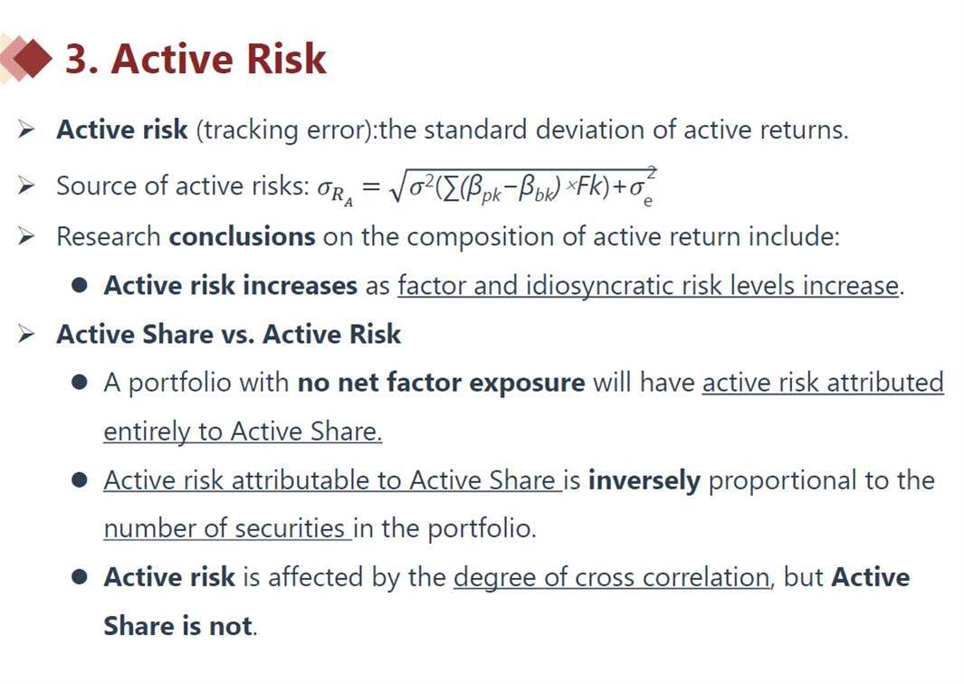1. 主动风险由因子的方差和非系统性风险方差决定;主动份额取决于主动配置的权重和基准的权重不同,组合配1个股票,基准配10个股票,这是不同,组合和基准的股票一致,但每个权重都不同,这也是不同。