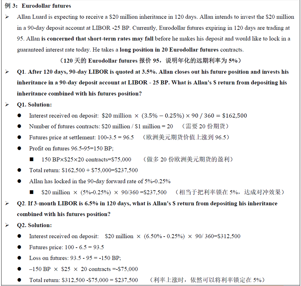 我们讲义上有一个例题,这个例题说明了为什么能锁定。原理和我之前回复你的是一样的,你借钱贵了,但你的对冲头寸能给你赚钱,相当于你没有花那么多利息借钱。反之你借出资金便宜了,你的对冲头寸也能给你赚钱,相寻于你多赚了一些利息。使用eurodollar futures无论你是borrower还是lender都可以锁定利率,锁定的就是eurodollar futures中隐含的forward rate。