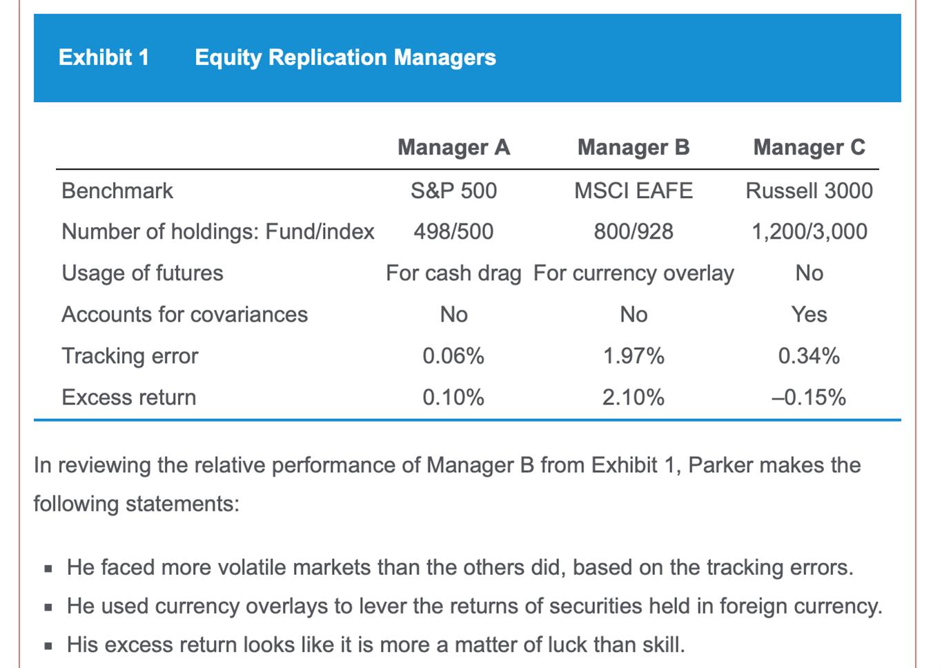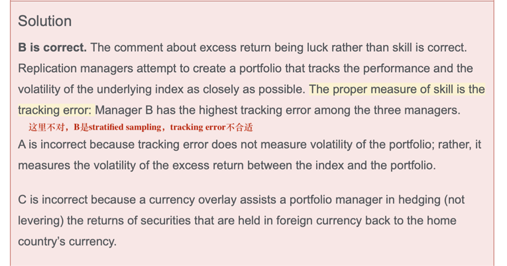 官网题equity Q9 如果是full replication manager,那把tracking error当作skill衡量标准是合理的,但manager B是stratified sampling,和完全复制就是不一样,就是必然有更高的tracking error。照这么说,full replication的skill肯定高于stratified sampling?这明显不合理!