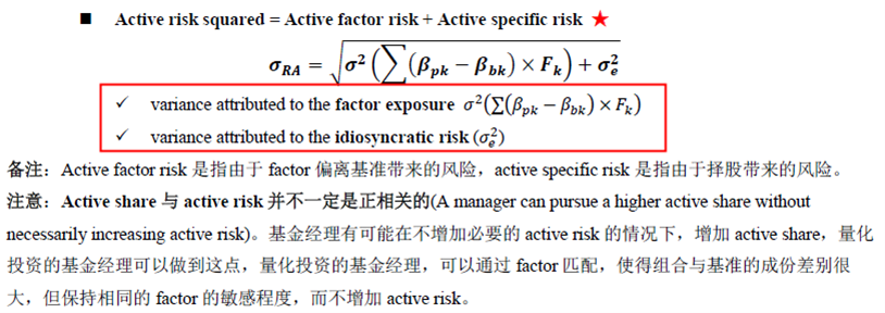 3.跟踪误差就是主动风险,源自因子的权重配置和idiosyncratic risk。