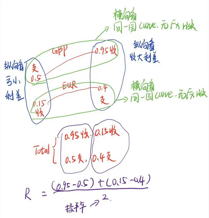 收三年的GBP固定,支GBP浮动,收EUR浮动,支EUR固定,这种做法本质就是在搞纵向套利差,横向对冲汇率风险。EUR 6个月和3年的收益率差(0.4%-0.15%)=0.25%,而GBP 6个月和3年的收益率差(0.95%-0.5%)=0.45%,所以是GBP两端差的更多,所以GBP是更陡峭的收益率曲线。而收3年GBP获得0.95%,支浮动支出-0.5%,而EUR,收6个月浮动0.15%支出3年的-0.4%,所以把他们叠加在一起得到收益是