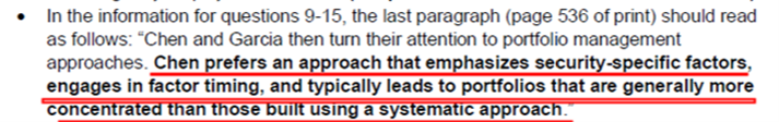 同学你好,协会勘误过了(见图),“does not engage in factor timing, and builds a diversified portfolio.”和“prefers an approach that emphasizes security-specific factors,”是矛盾的,所以他改掉了。勘误见图