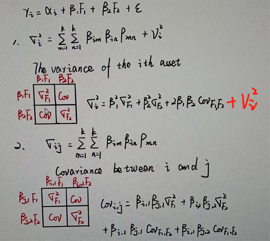 2.那么假设单个资产的回报率可以用两个factor来解释,则现在我们需要计算该资产的回报率公式中,对应的协方差是多少,即用两个因子的协方差矩阵来计算协方差即可。