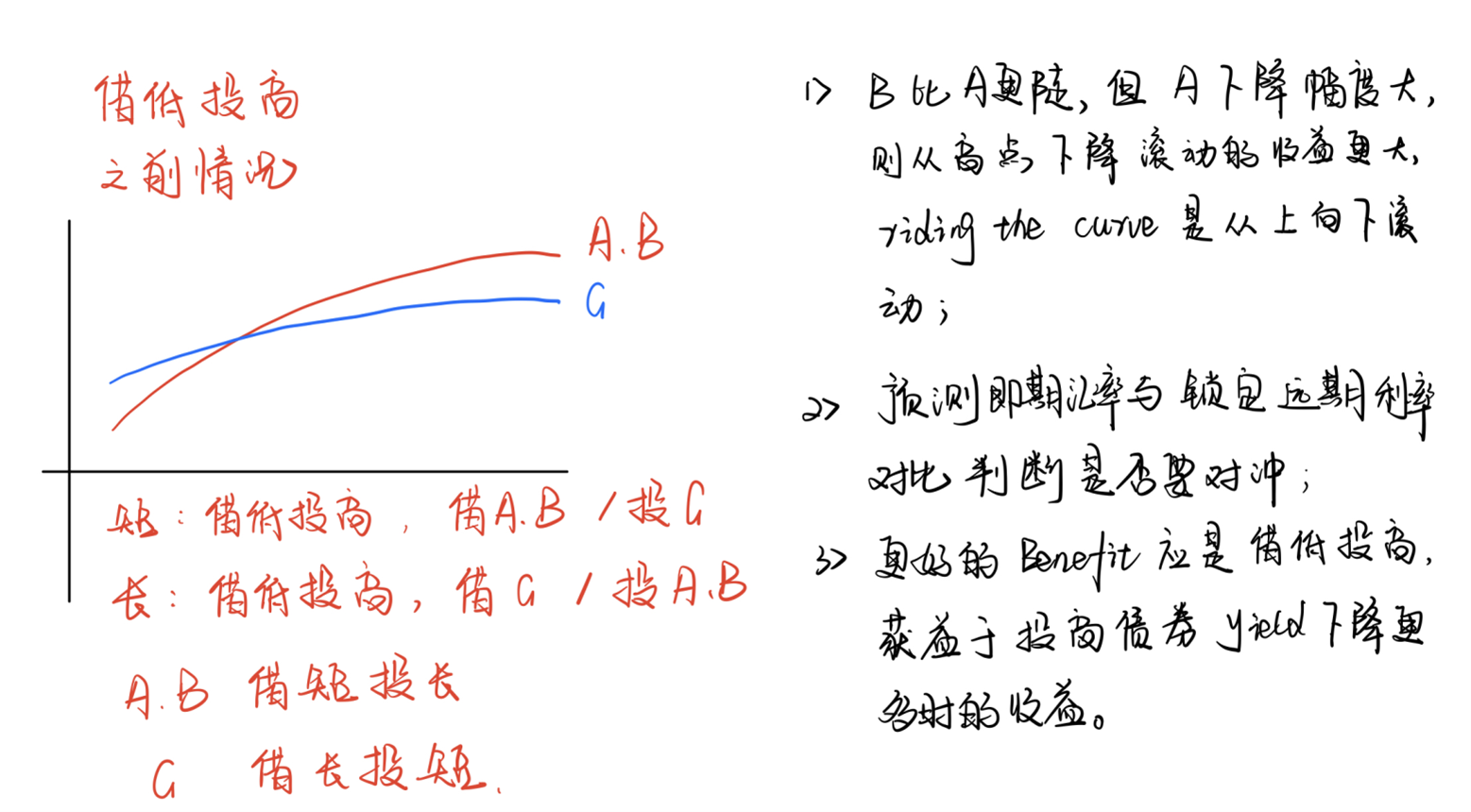 3.借低投高,投A、B长期,那么我已经以更高的收益率更低的价格买入了该部分债券,之后该点收益率下降,价格更高,我可以以更高的价格售出获利;