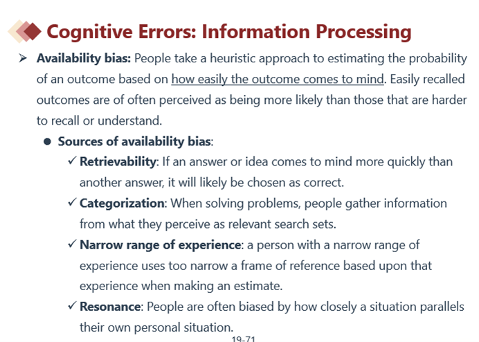 同学你好,这个在原版书和讲义上都是有写的。Availability bias有四个来源,可以参考下图,它给出了每个来源的名称和解释