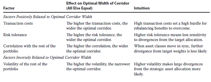同学你好,可否问下你说的越放心是指什么?如果不确定的话可以参照下图,交易成本越高,corridor越宽;风险承受能力越大,corridor越宽;该资产与其他资产的相关度越高,corridor越宽;组合内其余资产的波动率越大,则corridor越窄