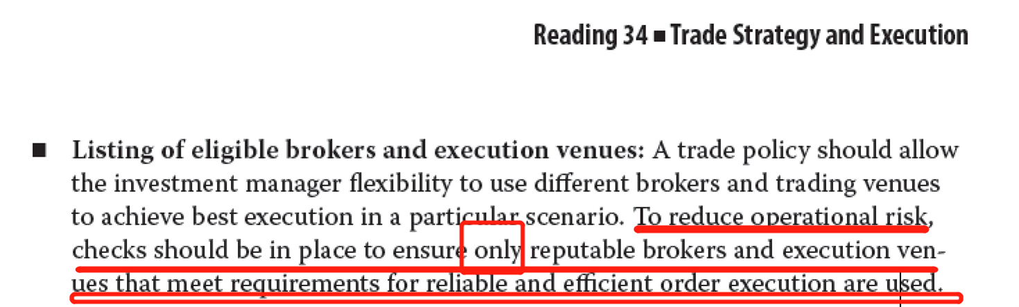 同学你好,这题问policy是否符合good trade governace. 原版书上说,trade policy应该保证manager只和声誉良好的broker和交易场所合作。manager可以在这些合格的broker中寻找合适的那一个。