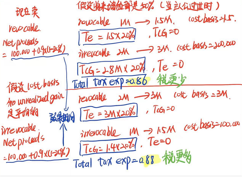 如果换过来我现在卖掉irrevocable的,留着revocable的,将来资本利得要交税,而且还要再交一票遗产税,这样总税率就高了。