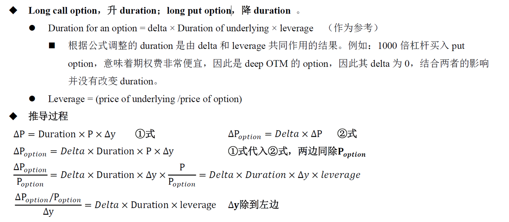 所以我就买债券价格跌了能给我提供保护的put就行。有了保护,就相当于做了对冲,我就不担心利率不张了。但我的组合久期是没有变化的,是原来那个数。