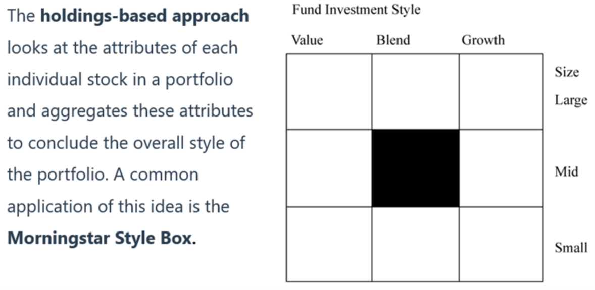 同学你好,style box是holdings based。这种方法是通过组合的持仓数据来计算它的持仓整体是大盘还是小盘,风格是成长还是价值,它是holding-based。